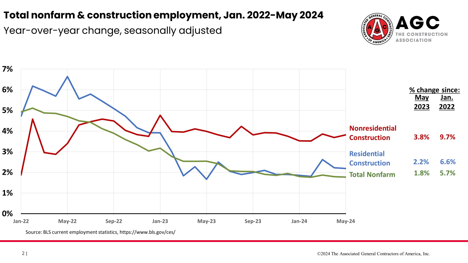 Construction employment, seasonally adjusted, totaled 8,228,000 in May, a gain of 21,000 from April and 251,000 (3.8 percent) year-over-year, according to Associated General Contractors of America’s (AGC) analysis of data the U.S. Bureau of Labor Statistics (BLS) posted.
