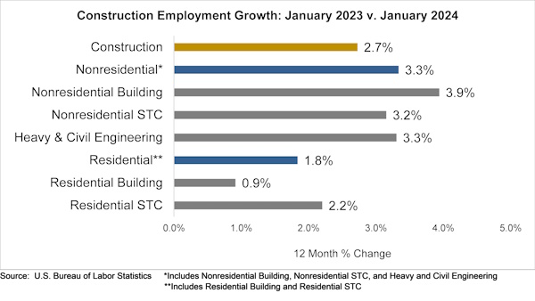The construction industry added 11,000 jobs in January, according to an Associated Builders and Contractors (ABC) analysis of data released today by the U.S. Bureau of Labor Statistics. On a year-over-year basis, industry employment expanded by 216,000 jobs, an increase of 2.7 percent.