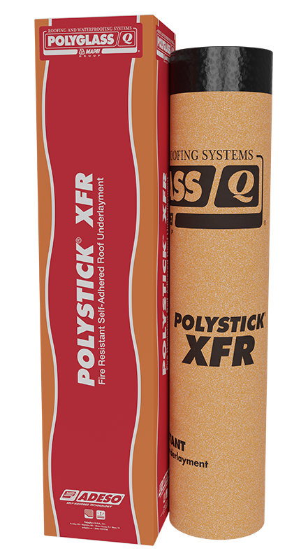 Polyglass’ Polystick XFR is a self-adhered, fire-resistant roof underlayment. It works in high-temperature applications including steel and copper roofing. The roof underlayment is rated to withstand temperatures to 265 F. It has Burn-Shield technology and provides UL Class A fire ratings for combustible decks. It also has ADESO dual-compound, self-adhered technology with an SBS (elastomeric)-modified bitumen upper compound and self-adhesive compound on the bottom.