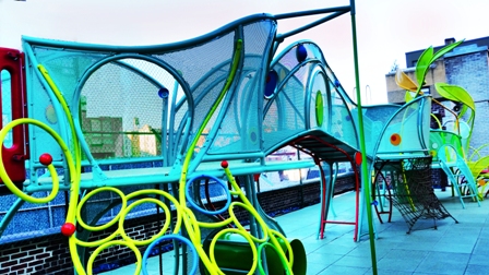 May and Watkins Design designed, fabricated and installed a custom play structure for Balfour Brickner Early Childhood Center at Stephen Wise Free Synagogue in New York City called Roof Top Play. The 15-foot-tall, 50-foot-long, 10-foot-wide play structure was constructed for primary recess activity in an open area on the building’s roof. Roof Top Play was powdercoated in RAL colors including Blue-Green, Vermillion, Neon Lime, Sky Blue and Yellow Ochre.