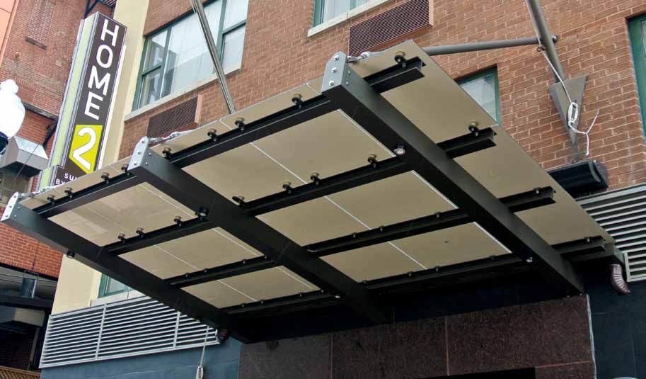 Located in Baltimore, the Baywood Hotel is owned by Park Hospitality LLC in Greenbelt, Md. Designed by Ammon Heisler Sachs, Baltimore, the hotel features a 126-square-foot canopy from Mapes Canopies LLC, Lincoln, Neb. The canopy is 14 feet wide with a 9-foot projection, and has a 6- by 6-inch support beam. The structure is covered in 2-coat Kynar in Mapes Bronze. The general contractor was DD&B Construction in Gaithersburg, Md.