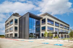 King of Texas Roofing also installed Petersen’s PAC-3000 metal composite material (MCM) panels in custom Deep Black on exterior and interior framing of the vestibule on the three-story building. The panels’ 30.48 cm (12 in.) width fits precisely between a series of 0.61 m (2 ft.) wide, three-story storefront openings; there aren’t any partial panels.