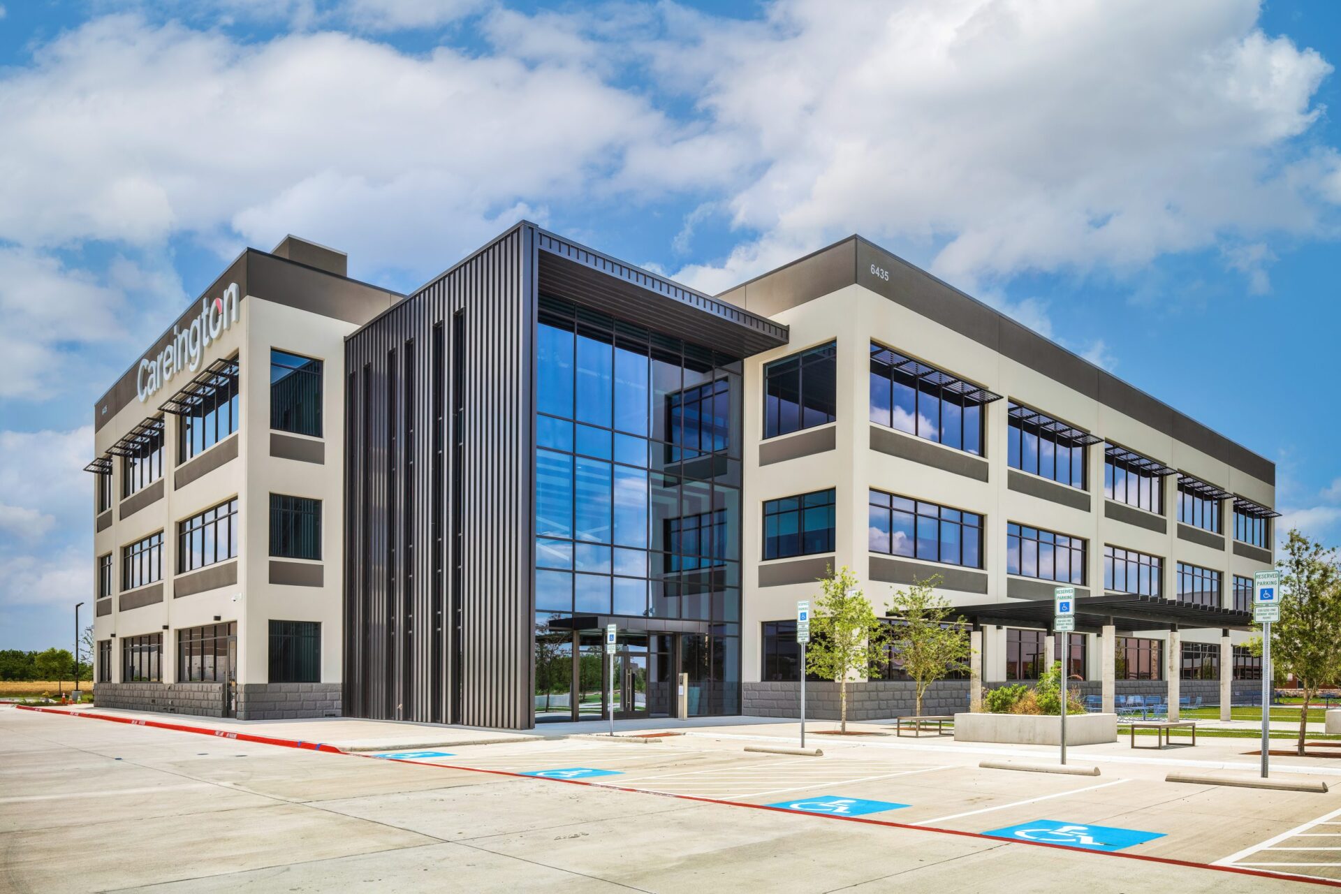 Merriman Anderson Architects Inc. designed a large, three-story vestibule with an entrance for Careington International and DialCare’s headquarters building. Standing seam metal panels wrap around the exterior of the vestibule and continue inside to the lobby.