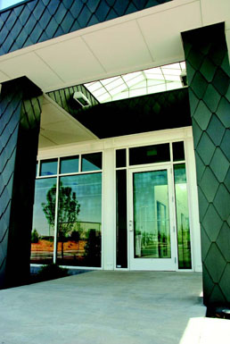 (139 m2) of 0.03-inch (0.8-mm) 22-gauge RHEINZINK Diamond Tiles finished in Graphite Gray. The facility also includes manufacturing and warehouse space.