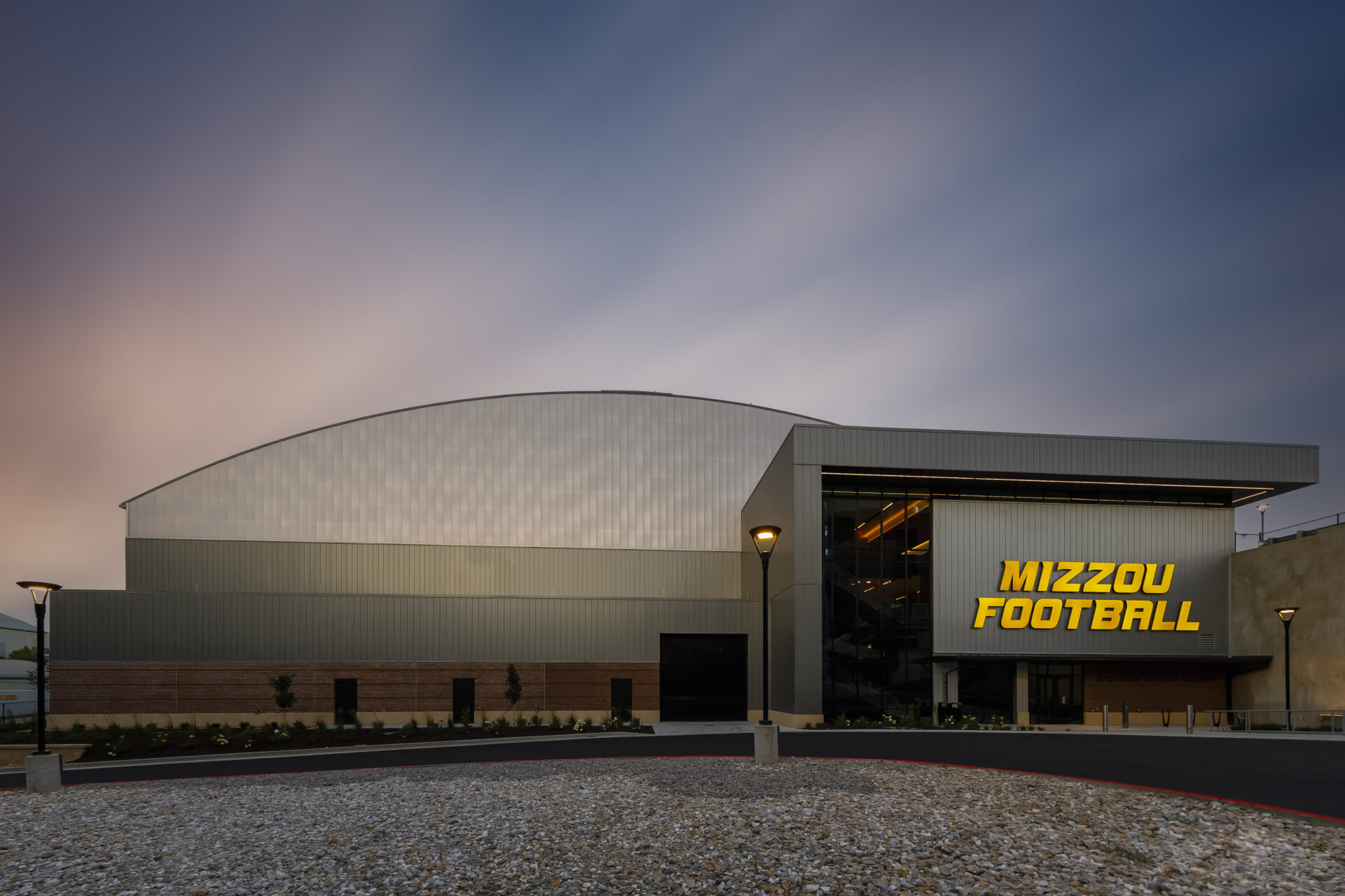 To meet project requirements for Stephens Indoor Facility’s building envelope and construction speed at University of Missouri, and to match school branding, HOK-Sport, a division of HOK, specified gray insulated metal panels (IMPs). The 8,026 m2 (86,400 sf) Stephens Indoor Facility is located next to Memorial Stadium and South End Zone Complex.