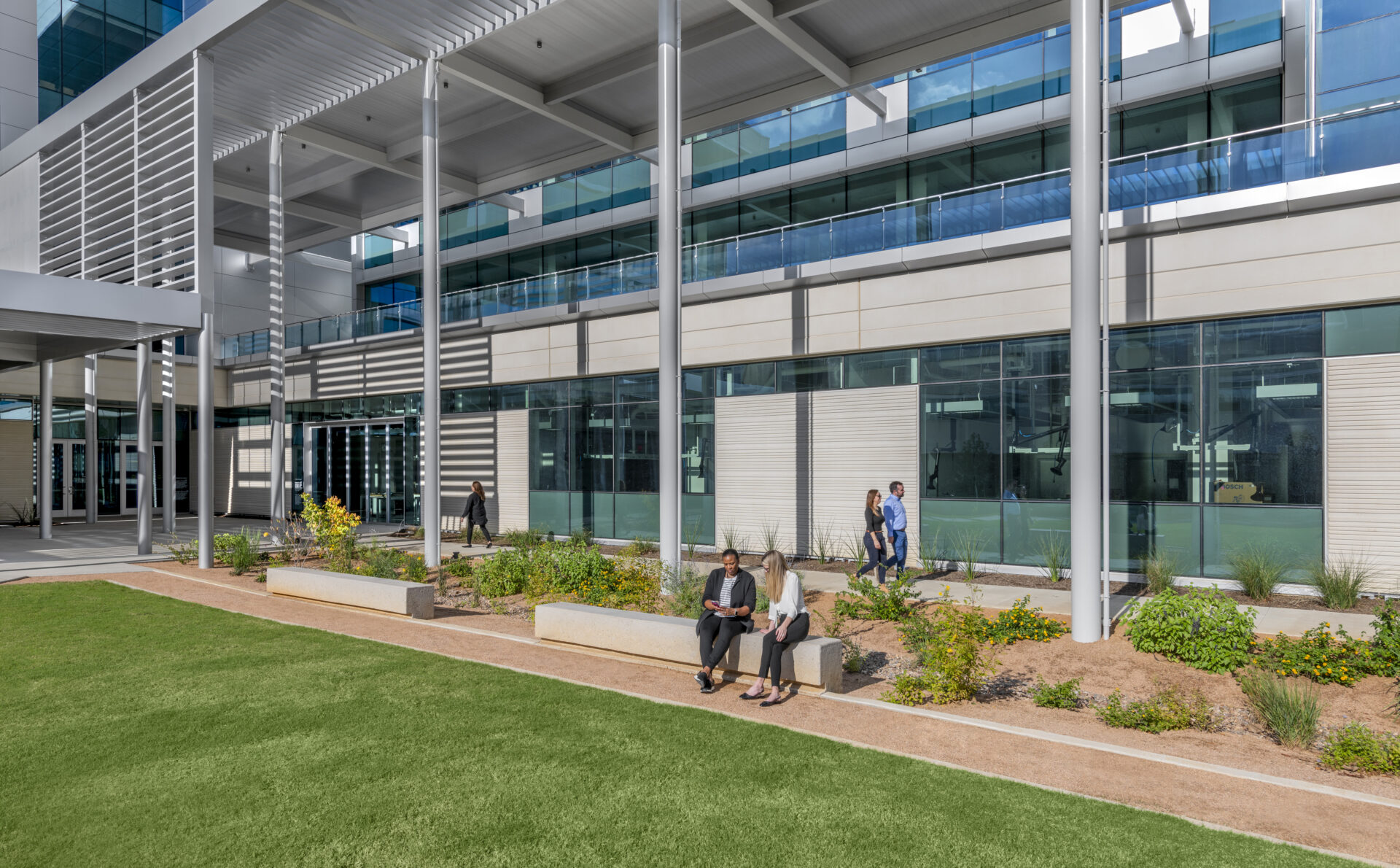 Although the BMES building was the fourth building on the East Campus, the campus lacked a sense of place with minimal continuity between buildings. The design team enveloped the iconic structure with a system of pedestrian-scaled canopies to build physical and experiential connections between buildings. At the facility’s main entry, a cantilevered canopy projects outward, welcoming visitors to the front door while reaching over to connect to the neighboring research building. The canopy then wraps the building, forming the perimeter edge of a new landscaped courtyard before stepping up to create a two-story pedestrian walkway and shade trellis over a level 2 roof terrace. The canopies are multi-faceted in their function and utility. They provide beneficial cover and shade for the building while crafting a human-scale arrival experience that connects occupants to the outdoor environment and the broader campus. Existing campus materials included metal elements accenting a primary palette of precast concrete and glass.