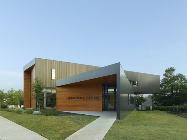 Since a creek floodplain covers much of the site for Fayetteville Montessori Elementary School, only a small triangle was available for building space. Marlon Blackwell Architects designed the two-story, 8,000-squarefoot school with a triangular ground floor and rectangular box for the second floor that extends over the floodplain and rests on a column. The modern structure is clad with a combination of cypress and Metal Sales Manufacturing Corp.’s corrugated metal wall panels in Valspar Corp.’s Fluropon Dark Bronze coating. The panels were specified to complement the cypress and contribute to a modern exterior.