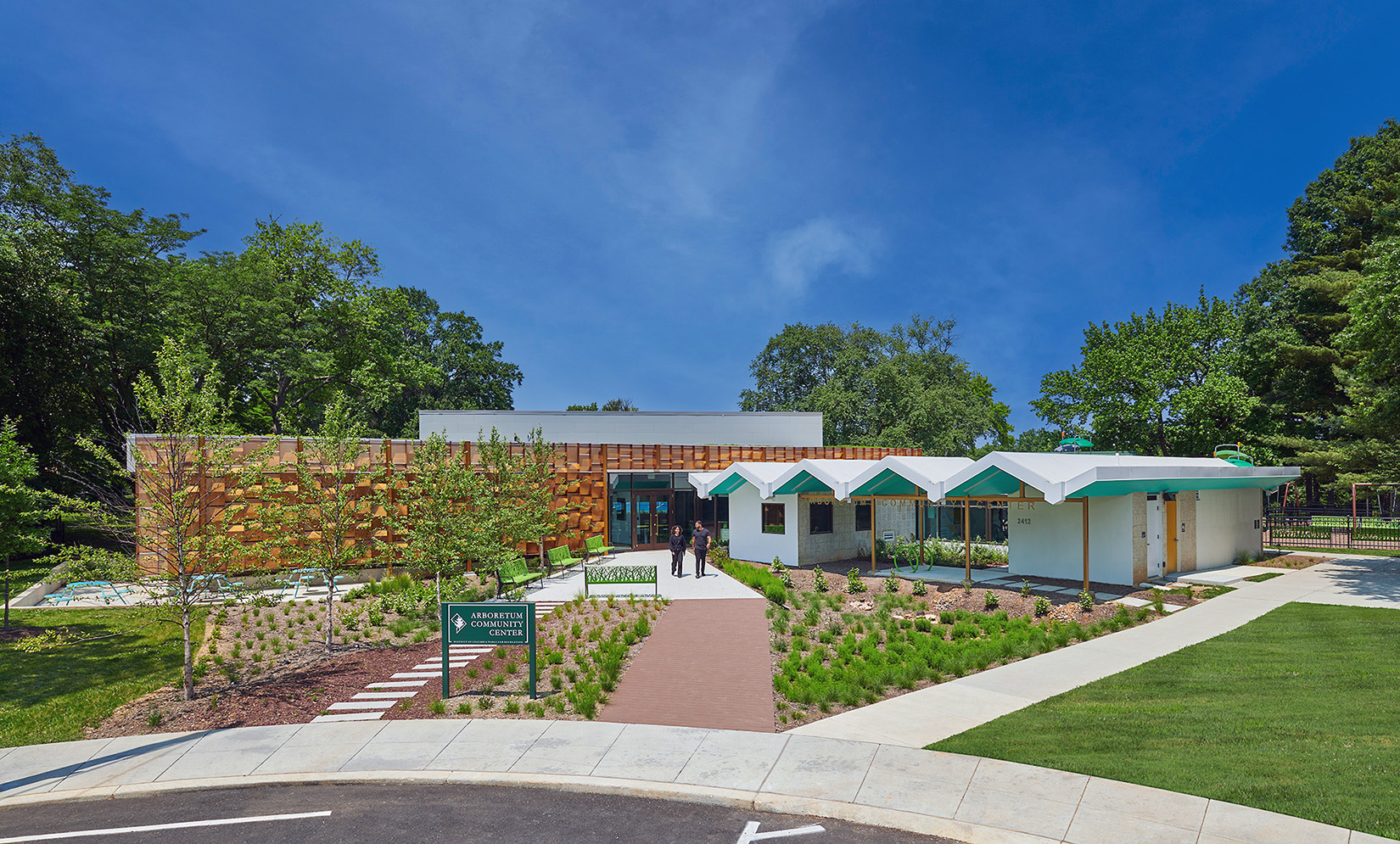 The screen, reminiscent of the nearby National Arboretum Visitors Center building, seamlessly merges modern design and sustainable features with the historic Mission 66 field house.