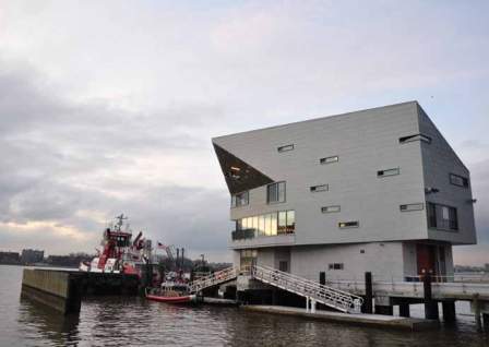 The 343 is a sleek new vessel that was commissioned in the wake of 9/11 and can travel up to 18 knots and pump 50,000 gallons of water, 50 times more than a typical fire truck. The 8,500-square-foot facility provides docking space for the 343 and other smaller vessels, as well as dormitory space for up to 10 firefighters at a time.