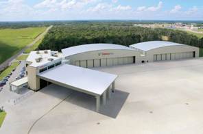 Mid-West Steel Building Co. supplied primary and secondary framing, 24-gauge BattenLok roof panels in Snow White and 24-gauge PBR wall panels in Ash Gray for the $7.9 million Galaxy FBO project at Lone Star Executive Airport. Completed in October 2013, the project consists of two 37,000-squarefoot hangars and two support buildings totaling 29,000 square feet. The hangars are 295 feet, 9 inches wide by 126 feet long with a 42-foot, 6-inch eave height and symmetrical, large barrel roofs that have 675-foot radiuses. Additionally, Empire Steel Erectors LP erected a three-story, 45,000-squarefoot tilt-wall terminal and office building.
