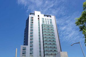 At ground level, at the building’s main entrance on the north side, RL Aluminum Panel and Glass installed Gamco’s CW250P curtainwall system. At ground floor entrances and retail spaces, RL Aluminum Panel and Glass installed Gamco’s FG 451-T storefront system and D350 medium stile entrance doors.