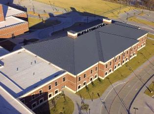The LEED Silver-certified project utilized 24-gauge, 12-inch flush metal wall panels; 24-gauge, 12-inch flush soffit panels; and 22-gauge Maxima 216 metal roof panels. The standing seam roof system incorporated reflective paint pigments.