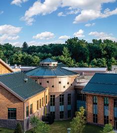 The circular, three-story media center’s roof was clad with Petersen Aluminum Corp.’s 16-inch Snap-Clad metal roof panels segmented to create the radius. The Imperial Co., the installer for the metal roof panels, also installed Snap-Clad panels on the pitched roofs of the four adjoining structures. More than 22,000 square feet of Snap-Clad 0.04-aluminum panels finished in Hartford Green and Dark Bronze were installed. Culotta says the only design challenges were reconciling the pitched roof and the size of the school, and detailing where the pitched roof came into the flat roof portions of the building.