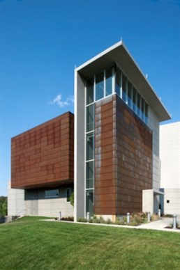 galvanized roof decking that was painted. “Had the addition come sooner or been smaller, we probably would have gone with those same exterior materials,” according to David Lempke, design principal with HDR Inc. “But one of the tenets of our design philosophy is that buildings should be ‘of our time.’ Something that has been intriguing for the past decade is the use of weathered steel. It has clearly become more commonplace in projects.”