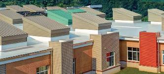 Peach State Roofing Inc. installed a variety of Petersen Aluminum Corp.’s PAC-CLAD profiles on the 107,000-square-foot school buildings, including 14,000 square feet of Tite-Loc Plus 24-gauge steel panels in Bone White, Champagne, Colonial Red and Arcadia Green; 6,000 square feet of 24-gauge 7.2 panels in Bone White, Sierra Tan and Terra Cotta; 4,000 square feet of 24-gauge M-36 panels in Champagne; 3,000 square feet of 24-gauge 2.67-inch-by- 7/8-inch Corrugated panels in Colonial Red; and 8,000 square feet of 0.032-inch aluminum PAC 850 soffit panels in Bone White.