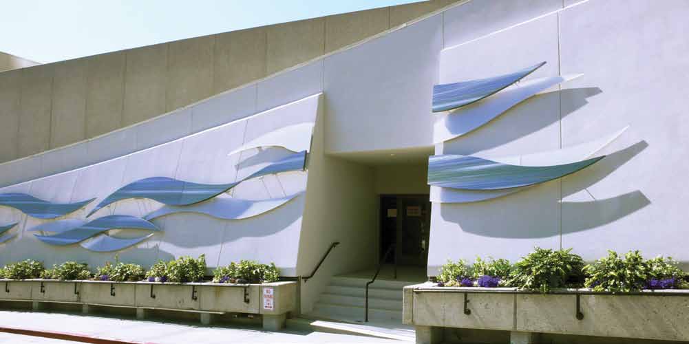 “The panels have an almost halographic effect, reminiscent of the reflections of sunlight on the surface of the water,” says Hobson. The panels were fabricated by Móz and nearly 50 individual segments were created, ranging from 3 to 24 feet in length. The precisionengineered segments were then assembled on-site into 20 waves that tapered from 30 inches wide to graceful end points.