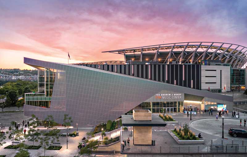 To create dynamic tension, GBBN Architects Inc. designed the Andrew J. Brady Music Center with two intertwined forms: a black box and a white box. To tie the forms together, GBBN designed an angled, perforated metal veil that drapes around the two boxes. In part, the dynamic building forms amplify the experience of pedestrians traveling downtown and to the Ohio River.