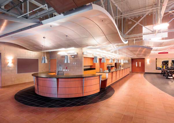 The Englert standing seam roof also provided the platform for a 60kW roof mounted photovoltaic system from American Solar Wholesale that will provide part of the energy needed to power the fitness facility throughout the year. LEED credits earned from using the standing seam metal roof and the photovoltaics will go toward owner and project facilitator, NAVFAC’s (Naval Engineering Facilities Engineering Command) Mid-Atlantic requirement of LEED Silver and HBA’s efforts to earn a LEED Gold certification for the facility, Ellis noted. The project earned LEED Gold from the USGBC. Most of the internal construction in the workout areas, basketball court and pool consisted of glazed masonry. The natatorium, weight room, and gymnasium used acoustical roof decking from Epic Metals Corp. to help reduce the noise level in the facility. Ellis also chose 2,100 square feet of curved perforated curtain aluminum ceiling material from Ceilings Plus for the reception area of the fitness facility. “We specified curved ceiling panels to allow daylighting to penetrate deeper into the reception area and to bring down the scale of the space and make the entry area more intimate in what is largely an open and airy facility,” says Ellis. At the direction of NAVFAC, the architect also established early contractor involvement with the construction team from Whiting Turner. This resulted in a construction manager at risk process that allowed HBA, co-architect firm, Hankins and Anderson Architects and Engineers, and Whiting Turner to work together to cultivate and assay the design. This led to cost savings early on.