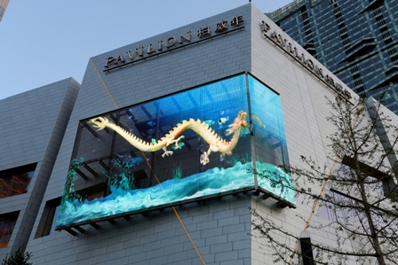 Photo: GKD-USANBBJ Design LLP incorporated two Mediamesh screens at entrances into Pavilion mall at Eton Place Dalian tower complex. The advertising screens wrap around two corners of the mall 40 feet from ground level.