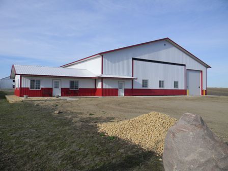 The 80-foot by 84-foot shop, completed in 2012, is white with red trim. The hydraulic door and the three windows in the door are outlined in red. The project included 10 inches of concrete floor for two wash basin areas that can be accessed with semitrailers on both sides of the building. The wash areas along the east and north walls have slight slopes of concrete floor that goes into 50- foot catch basins. Electrical outlets were installed on the walls for power washers.