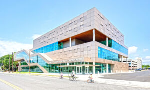 “Metal ceilings adorn the subtracted building mass and cantilevered, monumental stairs, extending the ceiling planes,” Jackson says. “This design element not only welcomes the community, but also extends the building’s presence into the surrounding campus, creating a seamless connection between the health center and its surroundings.”