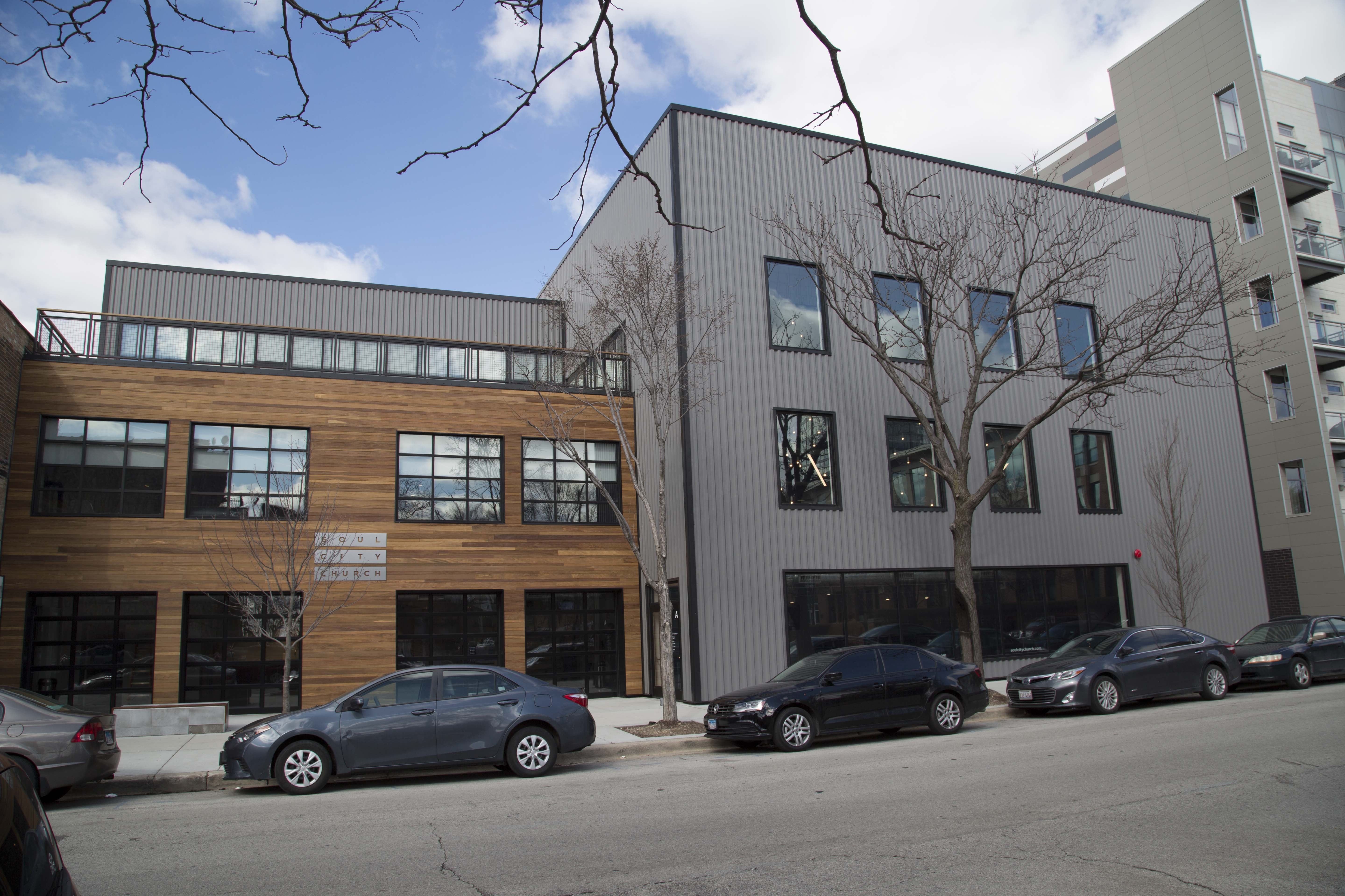 The exterior of Soul City Church features two contrasting cladding materials and an industrial appearance. Gray, vertical ribbed metal panels clad some of the building, and brown, horizontal wood paneling clads the rest. The scope of the project included renovating 20,000 square feet of the existing building and constructing a 29,000-square-foot addition.