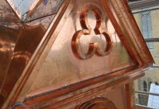 Chicago Metal Supply and Fabrication Inc. fabricated 1 1/2-inch double lock standing seam metal roof panels on-site with a portable standing seam roll former. The fabricator used cold mold technology to replicate historical, 20-ounce copper decorative finials, 20-ounce copper cornice with built-in gutters, 15,000 square feet of 20-ounce copper panels and cupolas. Conrad Roofing of Illinois installed the roof panels, flashings, decorative finials, 20-ounce copper cornices with built-in gutters and 2,000 square feet of genuine Buckingham slate.