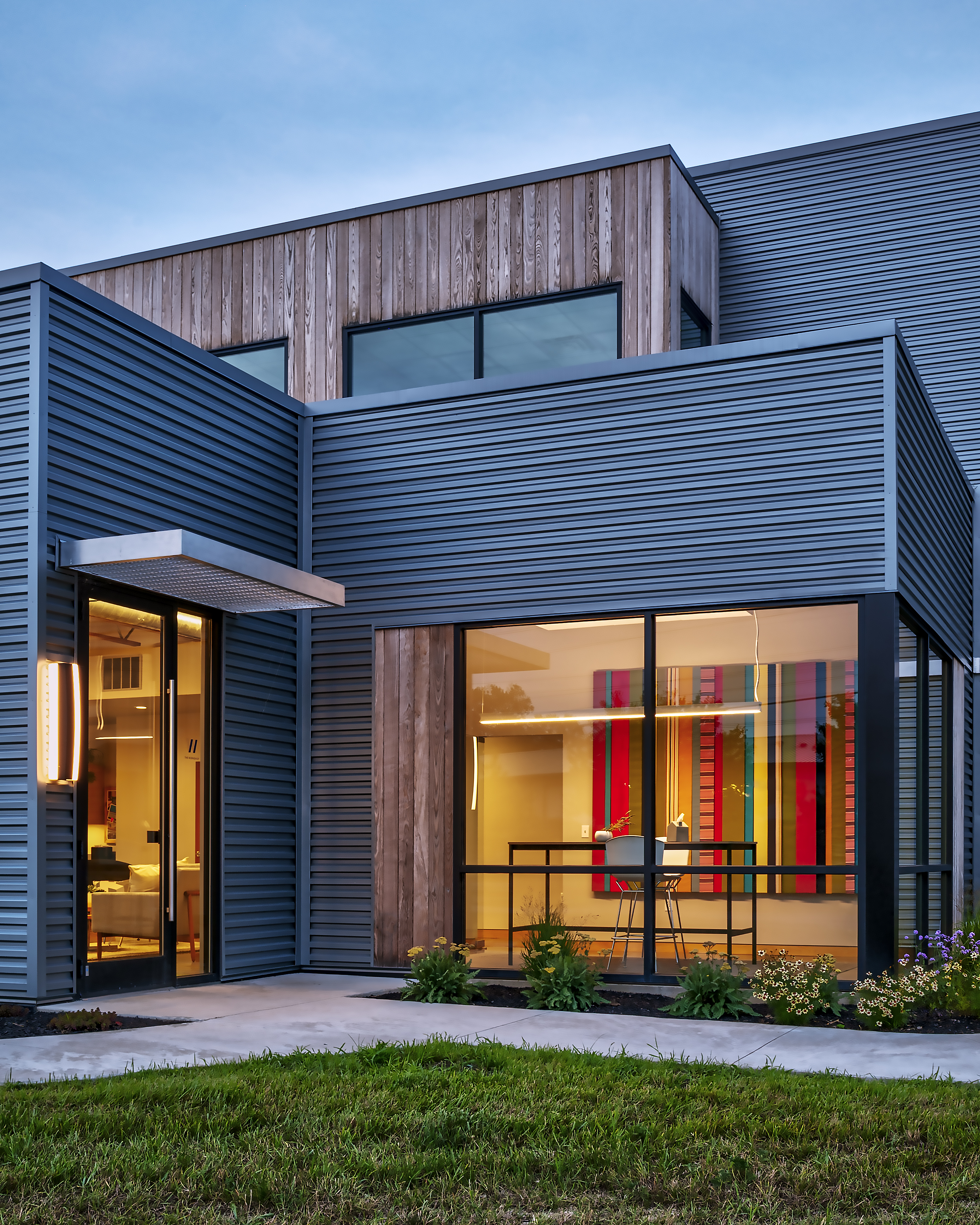 Furthermore, the gray metal siding contrasts with the thermally modified wood cladding accents. “In a similar way, bar grating, familiar in its use as an industrial walkway, is appropriated for the sunshades,” Joyner says. “This light, strong, straight, inexpensive and eminently practical material is used here to shade the windows. It works beautifully, cutting the glare and heat. Additionally, it practically shimmers in the light, changing throughout the day and casting dappled shadows on the façade and pavement.”